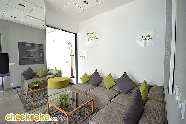ออกมาที่พื้นที่ส่วนรับแขก ขนาดระยะห่างจากโซฟากับทีวีมีพื้นที่จำกัดนิดนึงค่ะ