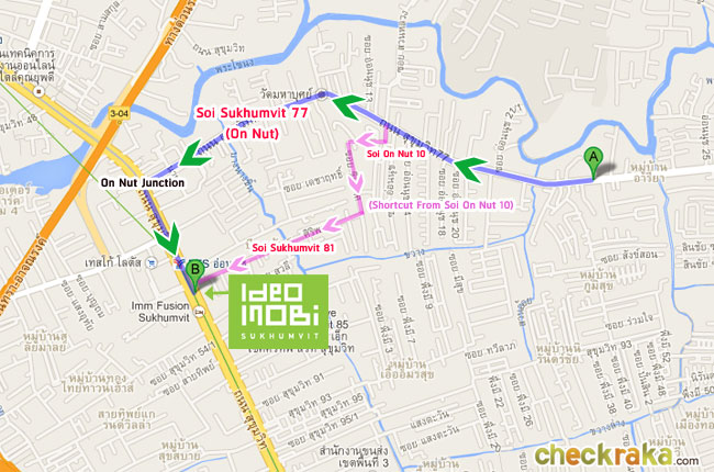 สำหรับการเดินทางด้วยรถไฟฟ้า สามารถเดินไปขึ้นรถไฟฟ้าได้ที่รถไฟฟ้า BTS สถานีอ่อนนุช (ห่างจากโครงการประมาณ 32 เมตร) (ดูเส้นทางการเดินรถได้จากแผนที่รถไฟฟ้าด้านล่าง) (We can travel by skytrain by walking to and from BTS On-Nut Station (about 32 meters away))