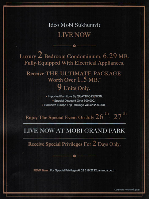 The condominium market in Thailand appears to be bouncing back as evidenced by the launch of several new projects during the past couple of months as opposed to the period of slow activity in the first half of this year. Today, we will accompany you to visit the condominium branded "IDEO" - IDEO Mobi Sukhumvit - which is not only a new project but also a ready-to-move-in project. This project is located almost right in front of BTS On-Nut Station (diagonally opposite to Tesco Lotus On-Nut). Let's go and check it out together then!!