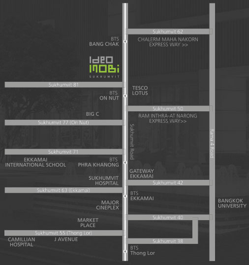 Ideo Mobi Sukhumvit is located on Sukhumvit Road (Sukhumvit 81), Bang Chak District, Phrakhanong Sub-District, Bangkok. It is close to On-Nut BTS Station, Chalerm Maha Nakhon Express Way (Bangna-Port), Chalongrat Expressway (Ramintra-Artnarong), Tesco Lotus On-Nut, and Big C On-Nut.