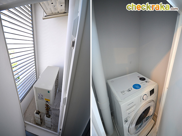 ส่วนนี้คือช่องด้านข้างทางซ้าย (ภาพซ้าย) และขวา (ภาพขวา) ของระเบียงที่ทางโครงการออกแบบให้ด้านนึงเป็นที่เก็บคอมแอร์สองตัว และอีกช่องนึงเป็นช่องสำหรับเก็บเครื่องซักผ้าค่ะ ทั้งหมดนี้มีบานประตูเล็กๆ ปิดด้วย