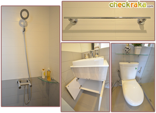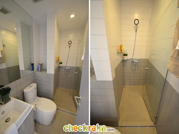 แยกออกจากพื้นที่ส่วนแห้งไว้ให้เรียบร้อย ที่ข้างโถส้วมมีผนังเว้าช่องไว้ให้วางของเล็กๆ น้อยๆ ได้