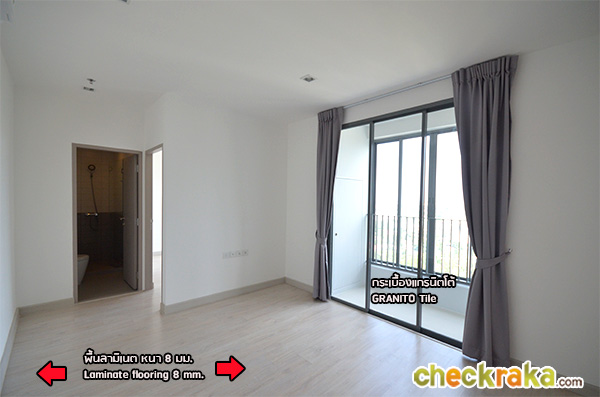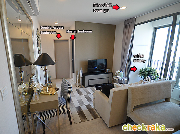 ห้องและวัสดุ - ยูนิตที่มีขายจากทางโครงการส่วนใหญ่ตอนนี้จะเป็นแบบ 2 ห้องนอน 1 ห้องน้ำ (หรือที่เรียกว่า 1 ห้องนอน Plus ซึ่งห้องแบบนี้ส่วนใหญ่จะเหลืออยู่ที่อาคาร B) และห้องประเภท Duplex ขนาดความสูงของห้องจะมี 2 ระดับ คือ 2.60 เมตรสําหรับส่วน Pantry และ 2.70 เมตรในทุกส่วนอื่นๆ ของห้อง จุดเด่นสัญลักษณ์ของ IDEO ซึ่งโครงการนี้ก็มีคือ มีประตู/กระจกกั้นระเบียง 2 ชั้น คือประตูบานเลื่อนกั้นระหว่างระเบียง และห้องน้่งเล่นเป็นชั้นแรก และด้านนอกระเบียงจะมีหน้าต่างบานเลื่อนอีกชั้นเป็นชั้นที่สอง เปิดได้เวลาที่เราอยากรับลม หรือตากผ้าตอนแดดออก และปิดได้เวลาเราอยากกันเสียง หรือตากผ้าตอนฝนตก ดังนั้น ส่วนระเบียงจึงเปิด-ปิดได้เป็นทั้ง Indoor และ Outdoor ในตัว คอมเพรสเซอร์แอร์มีประตูเล็กๆ ปิดเรียบร้อยสามารถนั่งระเบียงได้โดยไม่โดนเป่าใส่ พื้นที่ และ Layout ในบางจุดของแบบ 1 ห้องนอน Plus อาจไม่กว้างขวางมากนัก ดังนั้น หากใครตัวใหญ่ก็ขอแนะนําให้ลองเข้าไปชมห้องจริงดูก่อนนะคะ ในส่วนของห้องที่เรียกว่า Duplex นั้น จะไม่ใช่ห้อง Duplex แบบชั้นบนเปิดโล่งบานหน้าต่างยาวๆ ให้เห็นวิวแบบเต็มๆ แต่จะเป็นแบบยูนิตขนาดเท่ากันวางซ้อนกันบนพื้นที่สองชั้นมากกว่า โดยมีบันไดเป็นตัวเชื่อม และมีทางเข้า-ออกได้ในเแต่ละชั้น วัสดุในทุกยูนิตๆ จะเป็นประมาณนี้ค่ะ กุญแจ Keycard Digital Door Lock ของ Yale, บานประตูกรุลามิเนต, สุขภัณฑ์ Cotto พื้นแกรนิตโต้ 30x60 ซม. ในส่วน Pantry และพื้นลามิเนต 8 มม. ในส่วนอื่นๆ เครื่องปรับอากาศ Trane ชุดครัวจาก Modernform ปลั๊กและสวิตช์ไฟจาก Schneider เป็นต้น