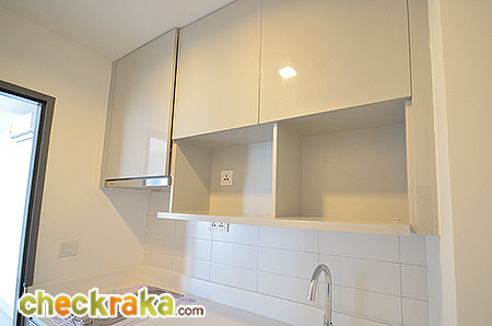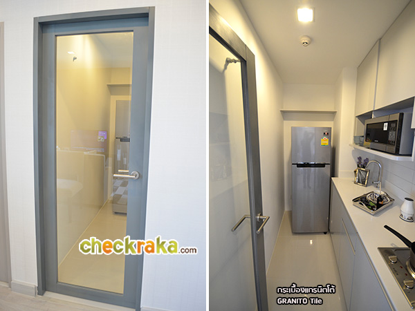 ภายในครัวติดตั้งบิ้วท์อินชุดครัว ส่วนช่องวางตู้เย็นที่เว้นไว้ค่อนข้างแคบไปนิดทำให้ประตูตู้เย็นเปิดสุดไม่ได้
