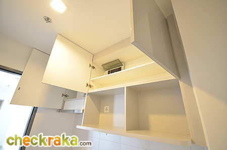 (The top pantry cupboard is painted with white color and surfaced with high-gloss finishing. Each pantry cupboard door is equipped with soft-close hinges with soft impact when the door is closed down)