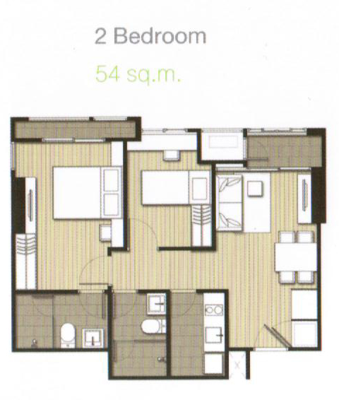 เนื่องจากยูนิตแบบนี้มีเพียง 1 ห้องน้ำ ดังนั้นประตูห้องน้ำจึงมีการออกแบบให้เข้าออกได้สองทาง