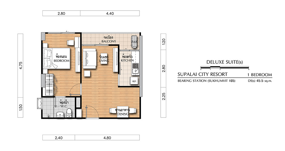 (คลิกเพื่อชมแปลนห้องขนาดใหญ่) - DELUXE SUITE (s) ห้องแบบ 1 BEDROOM (1 ห้องนอน, 1 ห้องน้ำ, 1 ห้องครัว) - เนื้อที่ 45.5 ตร.ม.