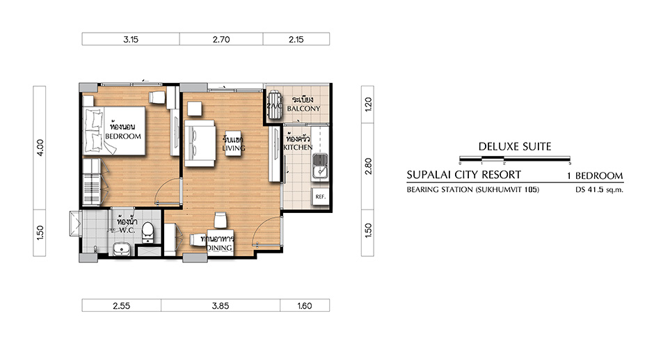 (คลิกเพื่อชมแปลนห้องขนาดใหญ่) - DELUXE SUITE ห้องแบบ 1 BEDROOM (1 ห้องนอน, 1 ห้องน้ำ, 1 ห้องครัว) - เนื้อที่ 41.5 ตร.ม.