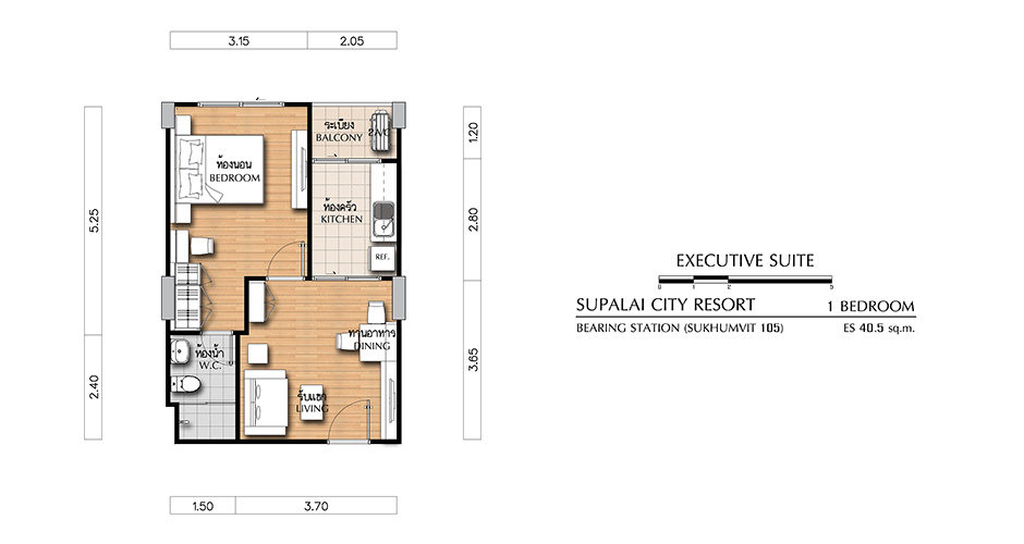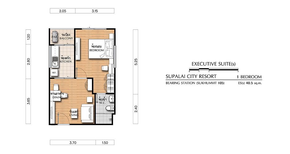 (คลิกเพื่อชมแปลนห้องขนาดใหญ่) - EXECUTIVE SUITE ห้องแบบ 1 BEDROOM (1 ห้องนอน, 1 ห้องน้ำ, 1 ห้องครัว) - เนื้อที่ 40.5 ตร.ม.