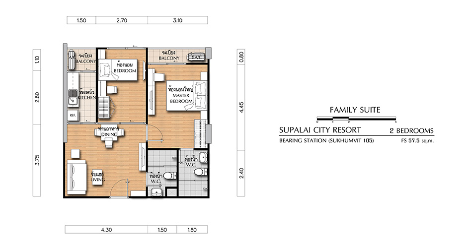 (คลิกเพื่อชมแปลนห้องขนาดใหญ่) - FAMILY SUITE ห้องแบบ 2 BEDROOM (2 ห้องนอน, 2 ห้องน้ำ, 1 ห้องครัว) - เนื้อที่ 57.5 ตร.ม.