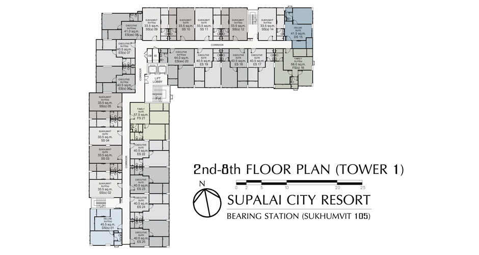 (คลิกเพื่อชมแปลนห้องขนาดใหญ่) - EXECUTIVE SUITE (es) ห้องแบบ 1 BEDROOM (1 ห้องนอน, 1 ห้องน้ำ, 1 ห้องครัว) - เนื้อที่ 41.5 ตร.ม.