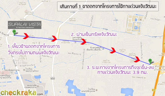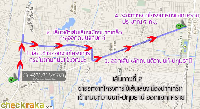 เส้นทางที่ 2 - ขาออกโครงการ ออกโดยใช้เส้นเลี่ยงเมืองปากเกร็ดเข้าถนนติวานนท์-ปทุมธานี ออกแยกแคราย