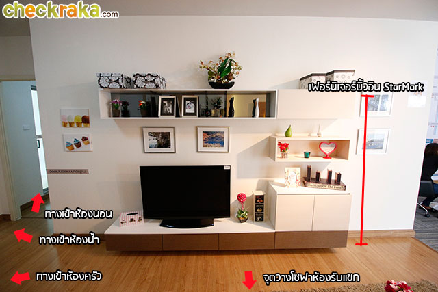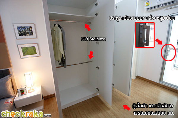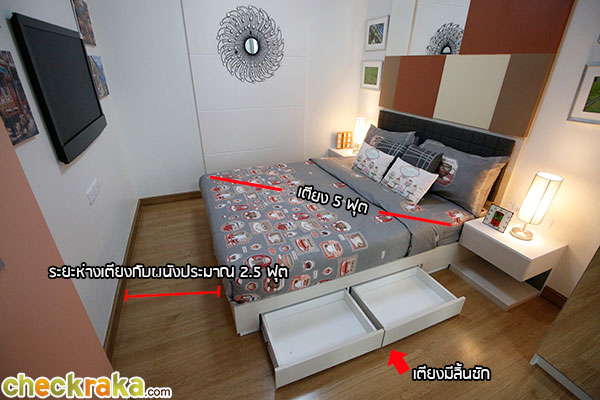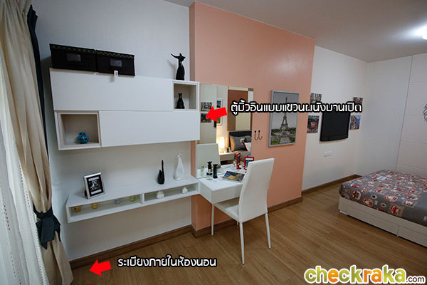 สัดส่วนของเฟอร์นิเจอร์บิ้วท์อินที่โครงการให้มายังมีพื้นที่เหลือด้านข้างทั้งซ้ายและขวาพอที่สามารถจัด
