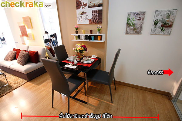 พื้นไม้ลามิเนตสำเร็จรูปสีโอ๊ค ใกล้กันกับโต๊ะรับประทานอาหารเป็นหัองครัวมีกระจกบานเลื่อนกั้นโซน