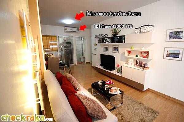 มุมมองจากฝั่งของโซฟามีระยะห่างระหว่างทีวีพอสมควรค่ะ สำหรับห้องรับแขกได้แอร์ Trane ขนาด 15000 BTU