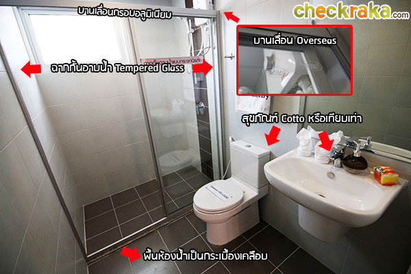 Shower Box ใหญ่พอสมควรไม่อึดอัด แยกพื้นที่ส่วนแห้ง-เปียกด้วยประตูบานเลื่อนอลูมิเนียมของ Overseas