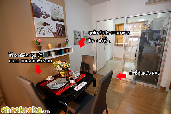 ชุดโต๊ะ+เก้าอี้สีเข้ากันกับพื้นห้องถูกวางอยู่ระหว่างโซฟากับห้องครัว ให้เก้าอี้ 3 ตัว