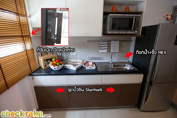 ชุดบิ้วท์อินห้องครัวเป็นของ Starmark ส่วน Top ครัวเป็นลามิเนต ได้อ่างล้างจาน+ก็อกน้ำของ MEX