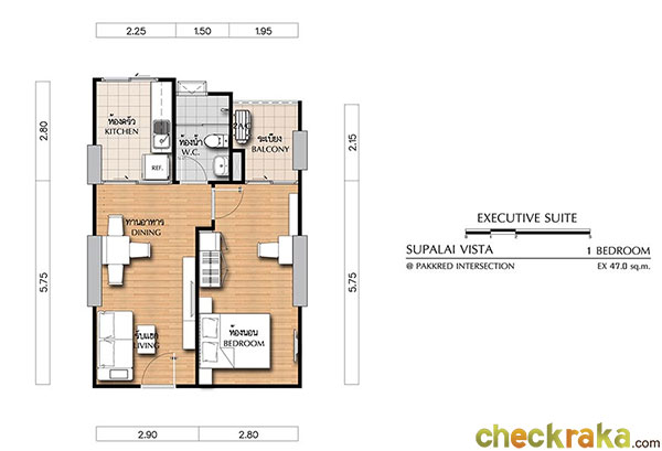 (คลิกเพื่อชมแปลนห้องขนาดใหญ่) - EXECUTIVE SUITE (ex) ห้องแบบ 1 BEDROOM (1 ห้องนอน, 1 ห้องน้ำ, 1 ห้องครัว) - เนื้อที่ 47.50 ตร.ม.