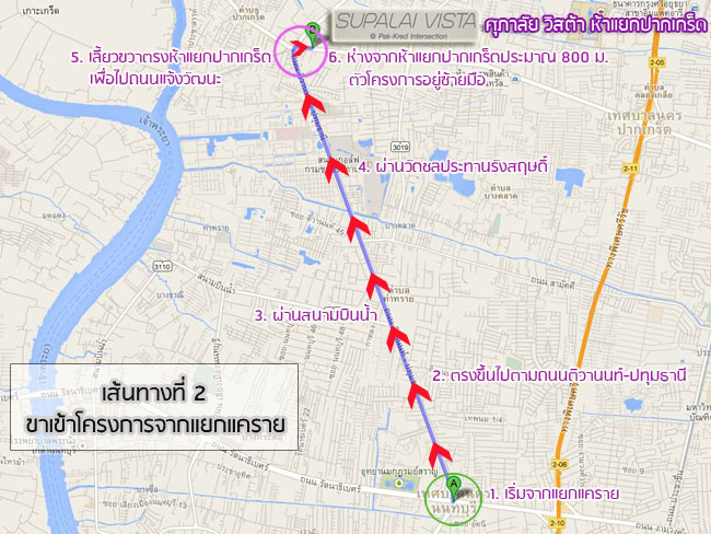เส้นทางที่ 2 - ขาออกโครงการ ออกโดยใช้เส้นเลี่ยงเมืองปากเกร็ดเข้าถนนติวานนท์-ปทุมธานี ออกแยกแคราย