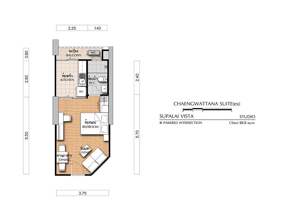 (คลิกเพื่อชมแปลนห้องขนาดใหญ่) - CHAENGWATTANA SUITE (ex) ห้องสตูดิโอ (1 ห้องน้ำ, 1 ห้องครัว) - เนื้อที่ 33.00 ตร.ม.