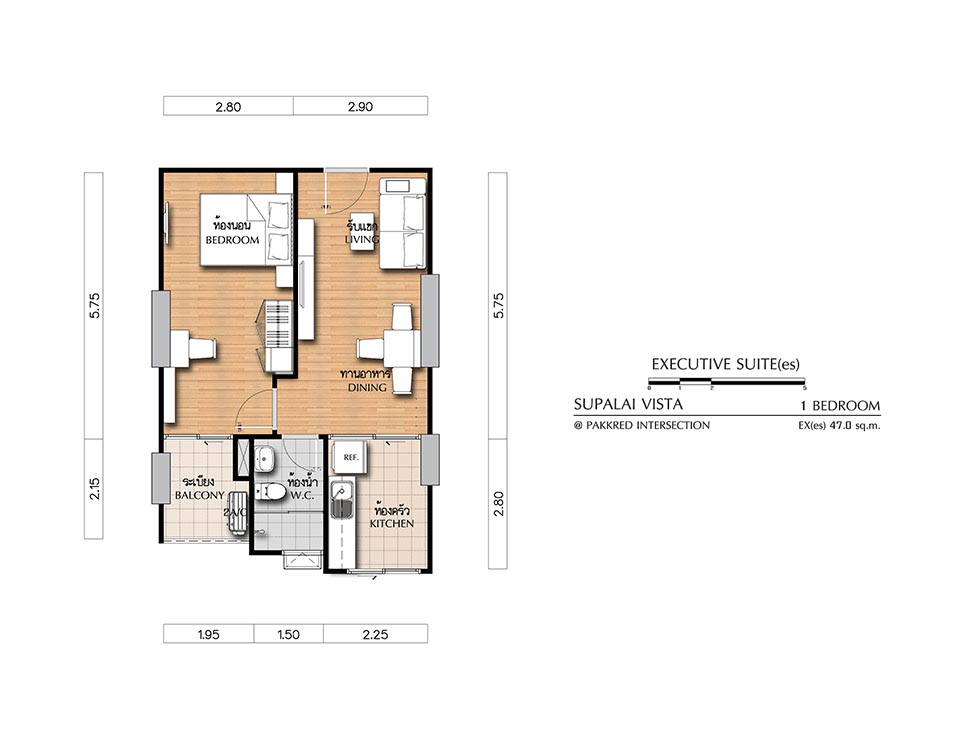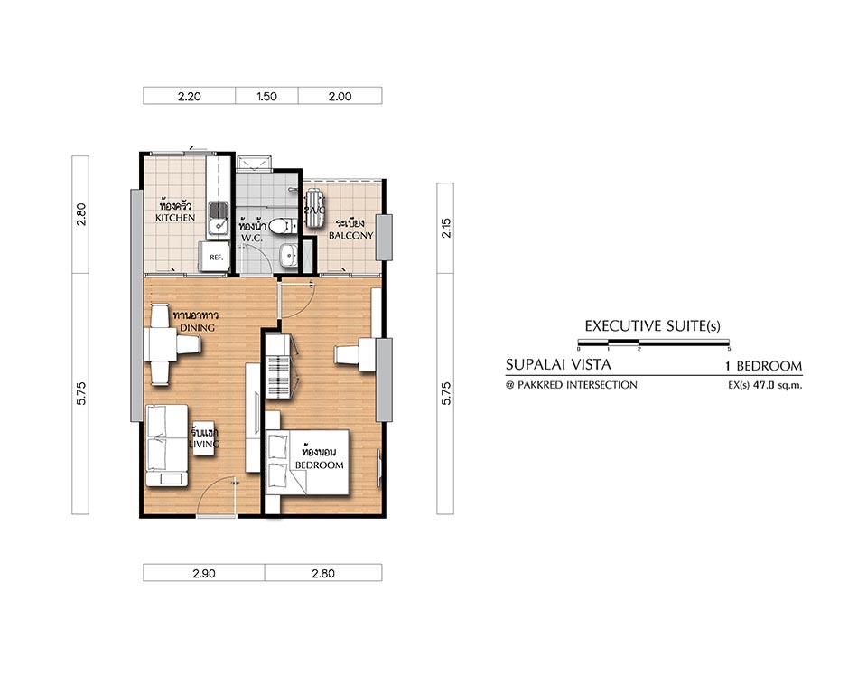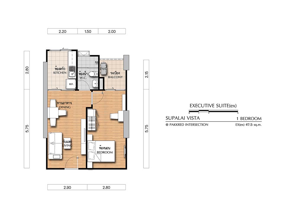 (คลิกเพื่อชมแปลนห้องขนาดใหญ่) - EXECUTIVE SUITE (ex) ห้องแบบ 1 BEDROOM (1 ห้องนอน, 1 ห้องน้ำ, 1 ห้องครัว) - เนื้อที่ 47.50 ตร.ม.