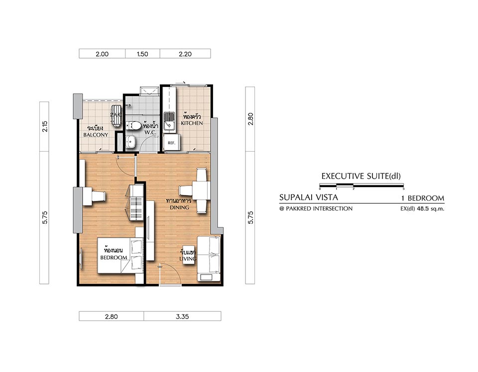 (คลิกเพื่อชมแปลนห้องขนาดใหญ่) - EXECUTIVE SUITE (dl) ห้องแบบ 1 BEDROOM (1 ห้องนอน, 1 ห้องน้ำ, 1 ห้องครัว) - เนื้อที่ 48.50 ตร.ม.