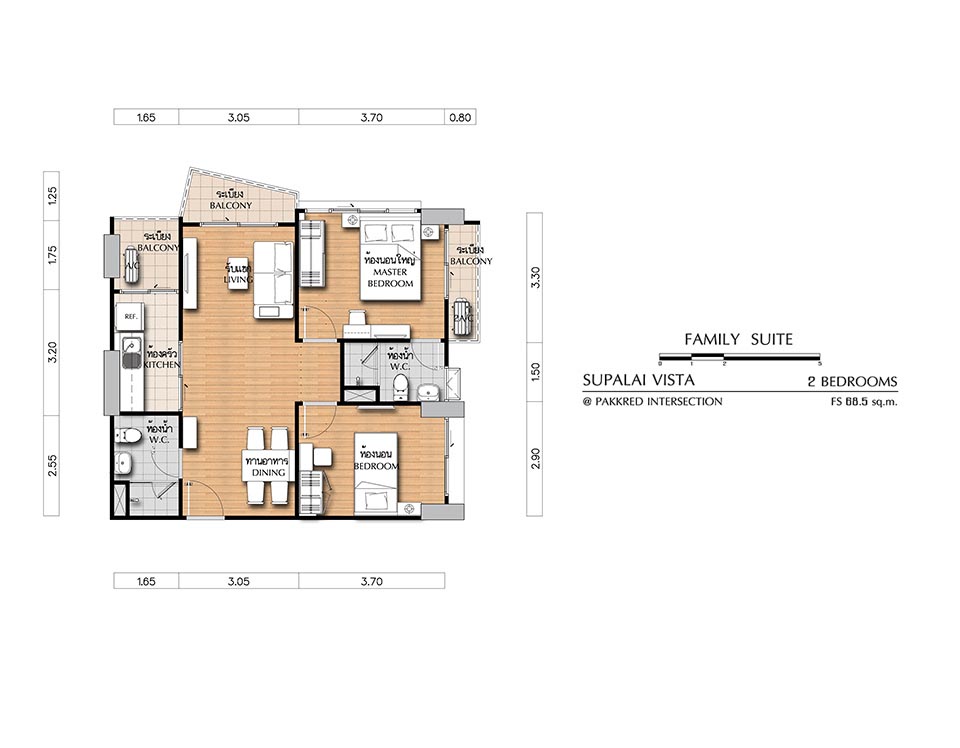 (คลิกเพื่อชมแปลนห้องขนาดใหญ่) - FAMILY SUITE ห้องแบบ 2 BEDROOM (2 ห้องนอน, 2 ห้องน้ำ, 1 ห้องครัว) - เนื้อที่ 66.50 ตร.ม.