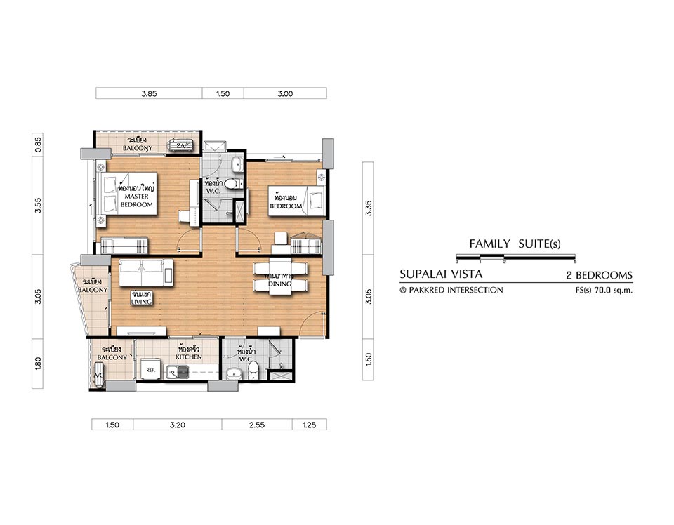 (คลิกเพื่อชมแปลนห้องขนาดใหญ่) - FAMILY SUITE (s) ห้องแบบ 2 BEDROOM (2 ห้องนอน, 2 ห้องน้ำ, 1 ห้องครัว) - เนื้อที่ 70.00 ตร.ม.