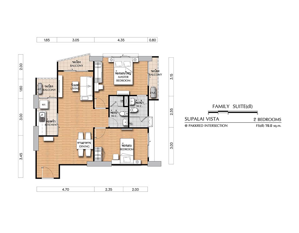 (คลิกเพื่อชมแปลนห้องขนาดใหญ่) - FAMILY SUITE (dl) ห้องแบบ 2 BEDROOM (2 ห้องนอน, 2 ห้องน้ำ, 1 ห้องครัว) - เนื้อที่ 79.00 ตร.ม.
