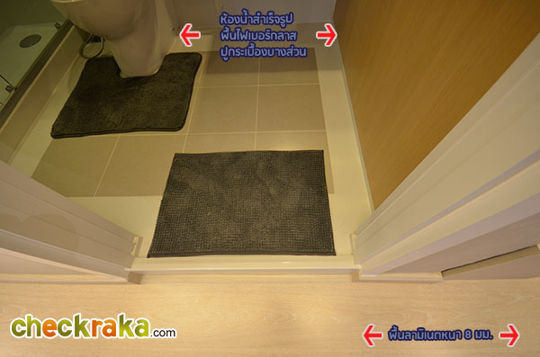 ส่วนห้องน้ำของที่นี่ให้เป็นห้องน้ำสำเร็จรูปนะคะ ธรณีห้องน้ำยกสูงกว่าพื้นห้องพอสมควรเลยค่ะ
