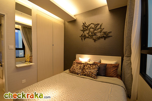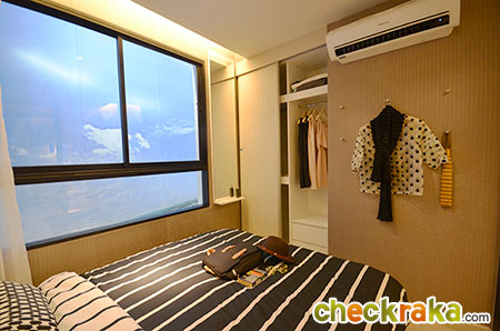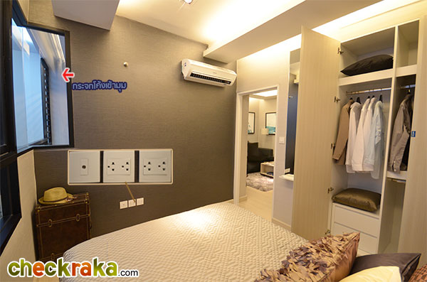 ทางโครงการเลือกใช้เฟอร์นิเจอร์แบบบิ้วท์อินทั้งโต๊ะเครื่องแป้งที่วางของได้นิดหน่อย และตู้เสื้อผ้าขนาด 2 บานประตูค่ะ