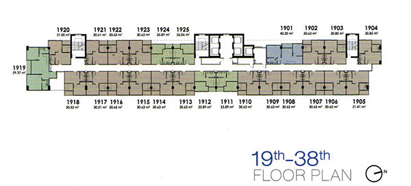 Floor Plan ชั้น 19-38 มียูนิตพักอาศัยอยู่ที่ 25 ยูนิต/ชั้น จำนวนยูนิตน้อยกว่าชั้น 8-18 อยู่ 1 ยูนิต