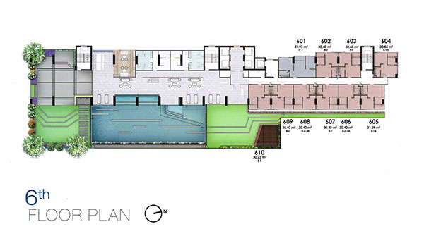 Floor Plan ชั้น 6 แบ่งพื้นที่ออกเป็น 2 ส่วน โดยพื้นที่ฝั่งซ้ายเป็นที่ตั้งของส่วนกลางอย่างสระว่ายน้ำ ห้องซาวน่า