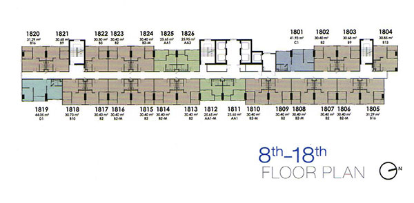 Floor Plan ชั้น 8-18 เป็นชั้นที่มียูนิตพักอาศัยสูงสุดคือ 26 ยูนิต/ ชั้น