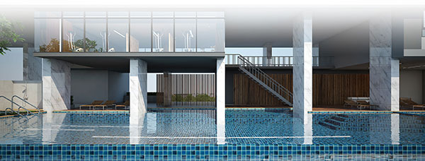 ภาพจำลองสระว่ายน้ำระบบเกลือที่ชั้น 6 และบันไดทางเชื่อมสู่ห้องฟิตเนสชั้น 7