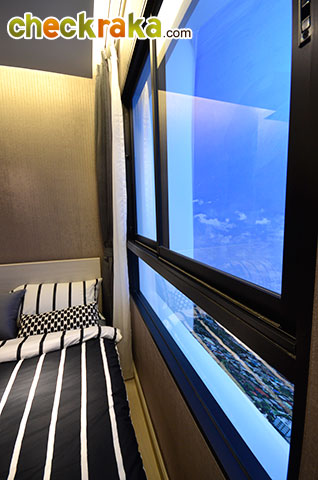 หน้าต่างในห้องนอนเป็นกระจกบานเลื่อนผสมบานฟิกซ์ แต่ห้องไซส์นี้ไม่ได้กระจกโค้งเข้ามุมเหมือนห้องก่อนหน้านะคะ