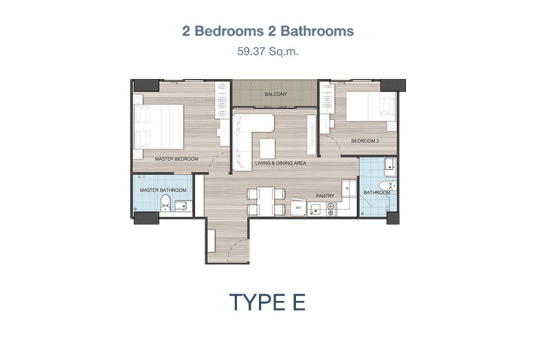 4) ห้องแบบ 2B-2 ขนาด 59.37 ตร.ม. ชั้น 19 ราคา 5.31 ล้านบาท (ราคา 89,517 บาท/ ตร.ม.)