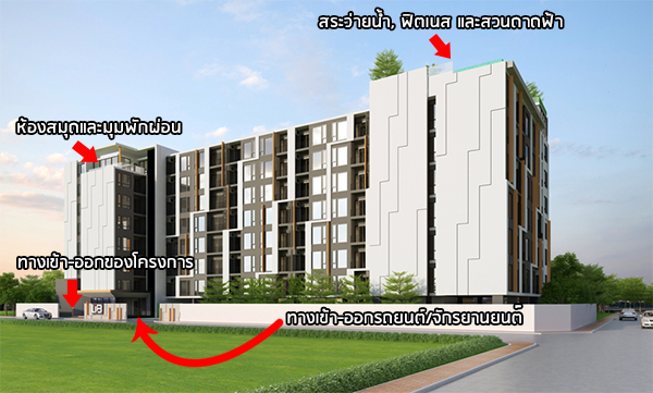 โครงการมีเพียง 1 อาคาร ตัวอาคารจะหันหน้ามาทางทิศตะวันตกและส่วนกลางจะอยู่ที่ชั้น 8 ทั้งหมดค่ะ จะมีห้องสมุด