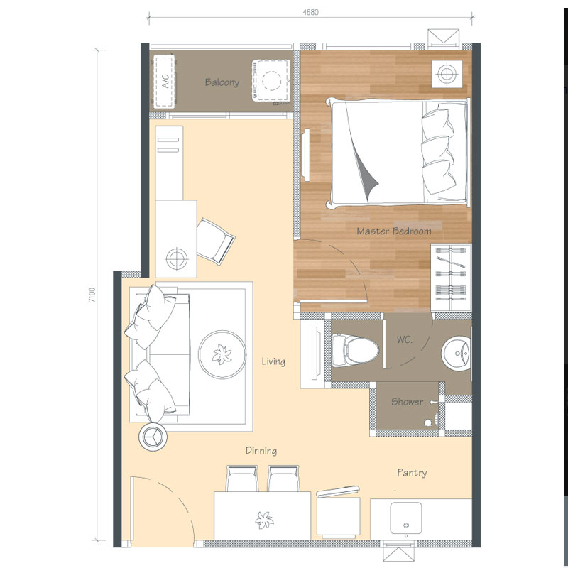 - ห้องแบบ E 1 ห้องนอน 1 ห้องน้ำ ขนาด 43.00 ตร.ม. (คลิกเพื่อชมแปลนห้องขนาดใหญ่)