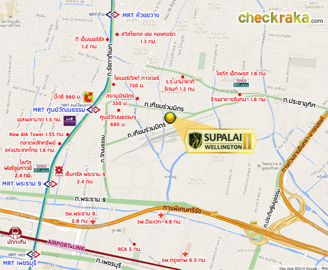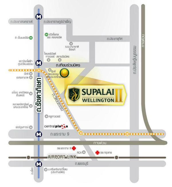 โครงการ ศุภาลัย เวลลิงตัน 2 ตั้งอยู่ใจกลางกรุงเทพฯ ในย่านรัชดาภิเษก ติดถนนใหญ่เทียมร่วมมิตร ห่างจากถนนรัชดาภิเษกประมาณ 750 เมตร สามารถเชื่อมต่อถนนธุรกิจสายสำคัญหลายสาย อาทิ ถนนพระราม 9 ถนนเพชรบุรี ถนนอโศก ถนนสุขุมวิท ถนนพหลโยธิน และถนนประดิษฐ์มนูธรรม ใกล้รถไฟฟ้า MRT สถานีศูนย์วัฒนธรรม และสถานีห้วยขวาง ในรัศมี 1-2 กิโลเมตรจากโครงการ รายล้อมด้วยห้างสรรพสินค้าขนาดใหญ่อย่าง เซ็นทรัลพระราม 9, เอสพลานาด, ฟอร์จูนทาวน์ และแหล่งรวมร้านอาหารอร่อยๆ ในย่านเหม่งจ๋าย ซึ่งทั้งหมดอยู่ไม่ห่างจากตัวโครงการมากนักค่ะ แต่ก็ไม่ได้ใกล้ขนาดที่สามารถเดินไปได้ คงต้องใช้รถในการเดินทาง