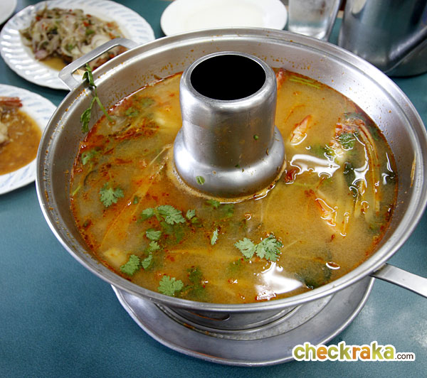 เมนูแรกต้มยำกุ้ง ใช้กุ้งแชบ๊วยตัวโตๆ น้ำต้มยำรสกลมกล่อมหอมเครื่องต้มยำ ตะไคร้ ใบมะกรูด