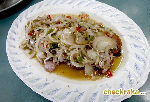 ปลาราดพริก ที่นี่ใช้ปลาอินทรีชิ้นใหญ่ ราดน้ำยำรสชาติเปรี้ยวนิดหวานหน่อย เผ็ดน้อยๆ อร่อยมากค่ะ