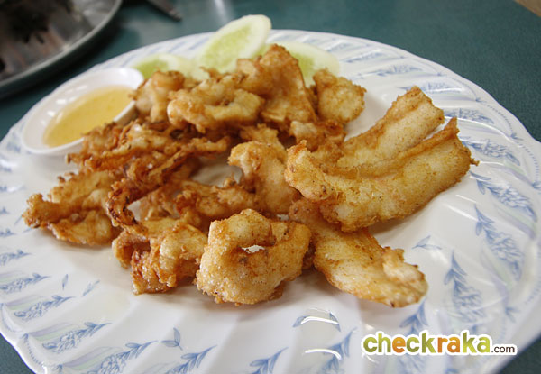 ปลาหมึกชุบแป้งทอด ใช้ปลาหมึกสด ชุบแป้งทอดกรอบๆ เสิร์ฟพร้อมน้ำจิ้มบ๊วย