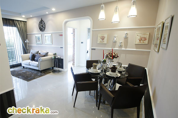 จากประตูมองตรงเข้ามาจะเป็นส่วนของโต๊ะทานข้าวอยู่ทางขวามือ ส่วนซ้ายมือจะเป็นห้องนั่งเล่น และห้องครัว