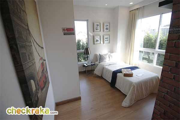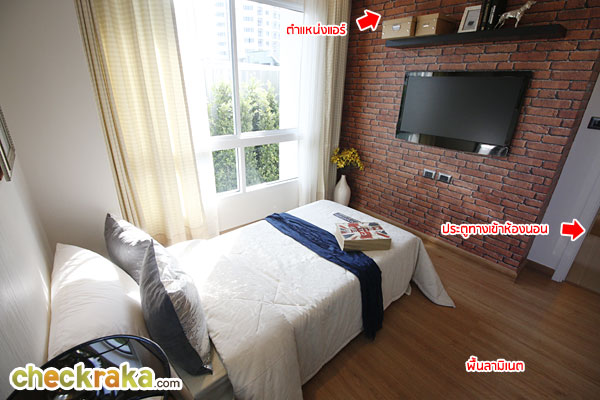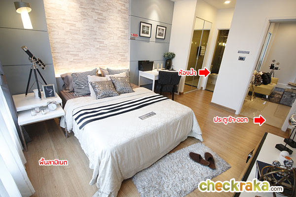 เดินเข้ามาดูส่วนของห้องนอน ด้านขวามือจะเป็นส่วนของห้องน้ำ พื้นห้องปูด้วยลามิเนตสีเนื้อไม้ ความหนา 12 มม.
