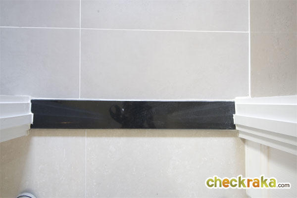 วงกบประตูห้องน้ำเป็นสีขาว ส่วนธรณีประตูห้องน้ำเป็นหินแกรนิตสีเข้มสูงกว่าตัวพื้นห้องน้ำขึ้นมาสัก 3-4 ซม.