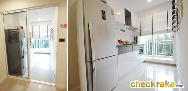 ห้องครัวเป็นแบบปิด ติดระเบียง ประตูเป็นบานเลื่อนกระจกแบบ 2 บาน กรอบอลูมิเนียมสีขาว ผนังทาสีขาวฉาบเรียบ