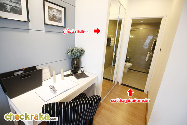 ธรณีกั้นห้องนอนและห้องน้ำเป็นแกรนิตไม่สูงมาก และด้านหน้าห้องน้ำสามารถทำเป็นตู้เสื้อผ้าแบบ Built-in ได้อีกด้วย