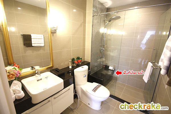พื้นห้องน้ำปูด้วยกระเบื้องแกรนิตโต้ แบ่งพื้นที่แห้งและพื้นที่เปียกไว้อย่างชัดเจน มีที่นั่งสำหรับอาบน้ำทำจากแกรนิตให้